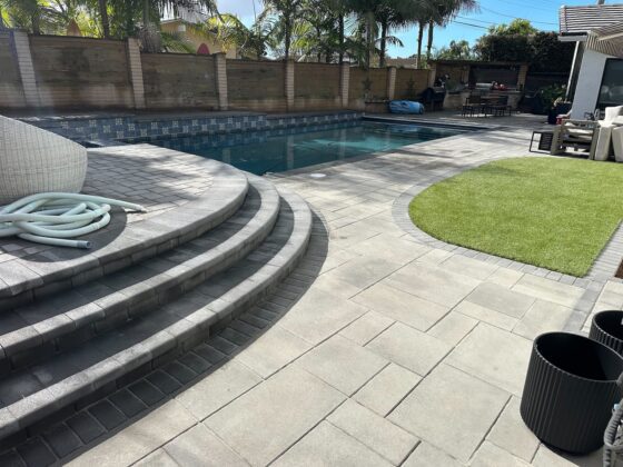 Finished pool deck with new pavers, bullnose steps, and a turf accent area that maximizes usable space around the pool.