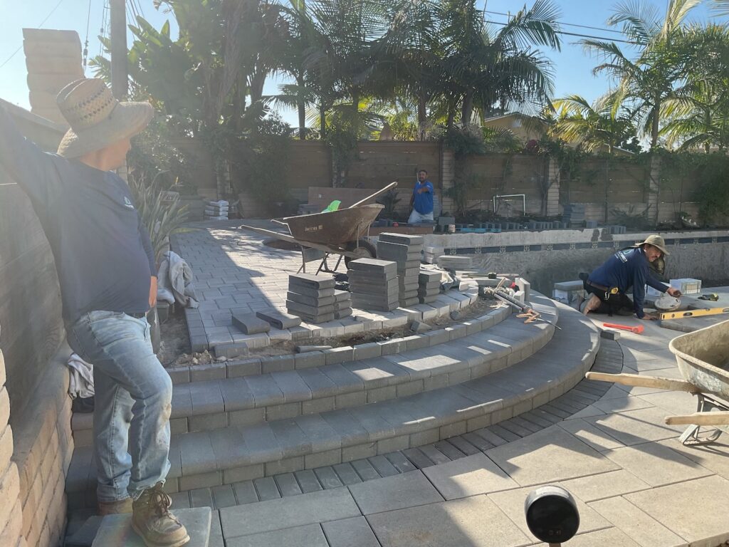 Demo and site prep -> drainage rough-in -> paver install and joint sand -> bullnose steps and cap details -> turf base prep and turf install -> final cleanup and punch list