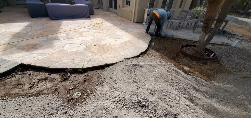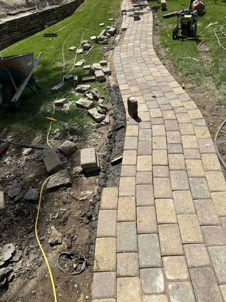 Pooling is prevented by combining proper base prep with a code-aligned drainage approach (CRC R401.3) so water moves predictably away from structures and toward intended collection/dispersion areas. When needed, we integrate drain line solutions (like SDR35) to keep runoff controlled.