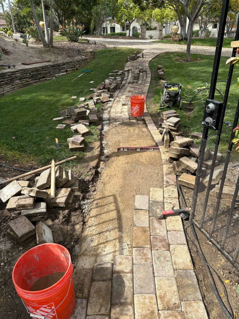 Phasing: Site protection → demo/excavation → base prep & fine grading → drainage + irrigation adjustments → mow-strip edging & stepping stones → turf install + seaming/infill → stabilized DG install → final detail + cleanup