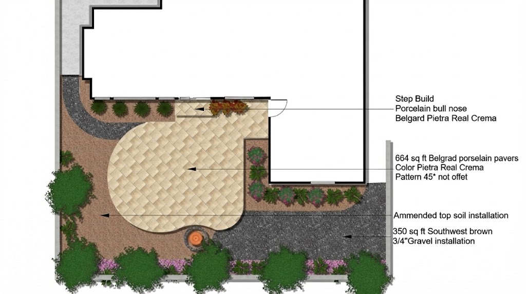 - Materials & Aesthetics: Install Belgard Dimensions 12×24 porcelain pavers in “Linen” on a 45-degree layout pattern, with Ivory Cream river rock borders, Southwest Brown gravel, and Blue Moon boulders to soften and frame the hardscape.