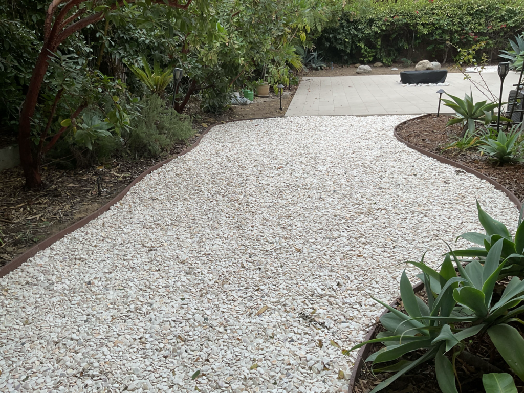 • Gas: Installed underground ¾″ yellow PE (polyethylene) gas pipe with factory-rated risers, installed per SDG&E trench depth and separation standards, and pressure-tested to code prior to backfill. A dedicated shut-off valve was added at the fire pit for safe operation. • Drainage: 3″ SDR35 drain line tied into catch basins and micro channel drains along the patio edge to move water off the surface and into decorative rock beds. • Electric / Lighting: Low-voltage lighting installed per NEC Article 411 using UL-listed Pro-Trade components, with proper burial depth, conduit routing, and required separation from the gas line. Powered by a Pro-Trade 150W stainless transformer with smart socket timer. • Irrigation: Existing irrigation adjusted to accommodate the new patio footprint and rock borders, with drip lines for any remaining planting zones.