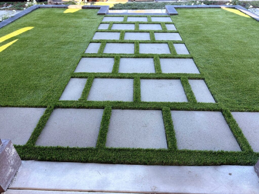 Large-format Angelus Paseo II paver steppers set within artificial grass to guide movement while keeping the layout open.