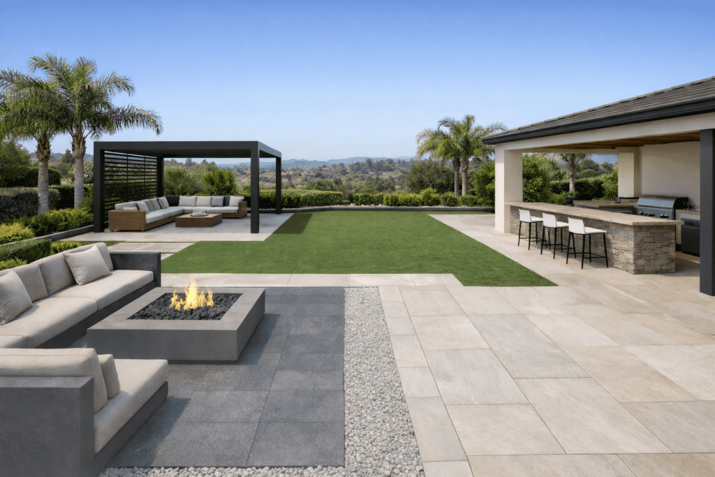 | Patio surface | Quality concrete pavers, clean joints, disciplined pattern | Large-format pavers, tighter geometry, premium edge restraint | Outdoor porcelain system or premium slab-look with full system spec |