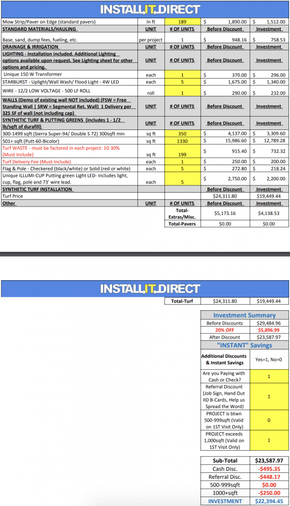 - Here we are 3 months after the “completion” of our synthetic putting green and our job has still not been corrected and fixed. We have 2 lighted holes that don’t work, flags missing and that don’t match, large piles of debris that needs to be hauled off, but more importantly, seams that the company is not addressing. We know now in talking to the crew that the job was mis-measured from the get-go, which is why the design was altered without our authorization using more rough to try and hide some of the seams. Other seams are still apparent right down the middle of the green either due to poor workmanship, different batch orders, or perhaps both. Bottom line, you don’t want to see seams on a putting green anymore than you do in carpet. And it is more critical to not have them on a putting green because they can affect the roll of the ball for the truly avid golfers. We have had a portable toilet by the green for months now that we and I’m sure our neighbors are tired of looking at. We just want everything fixed and the job done right. We keep asking the owner Tim that if he paid over $22k for something, wouldn’t he expect to get what he paid for and within the time frame promised? It’s just a poor way to run a business and I’m not sure how he can expect to get repeat business or even new business operating this way. Mistakes are going to happen but ignoring them is not going to make them go away and how Install It Direct has chosen to deal with this issue is a true depiction of their character as a company. I’m sticking with 1 star.