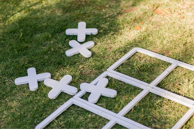 An over-sized game of tic-tac-toe is fun for all ages and easy to make. You can create the squares with sticks, pool noodles, tape, rope, or just about anything you can use to create a relatively straight line. For a game you can easily put away and take out again later, you could paint the playing board on a small tarp. If you are playing on a patio or walkway, you can use sidewalk chalk to dray the tic-tac-toe board on the ground.