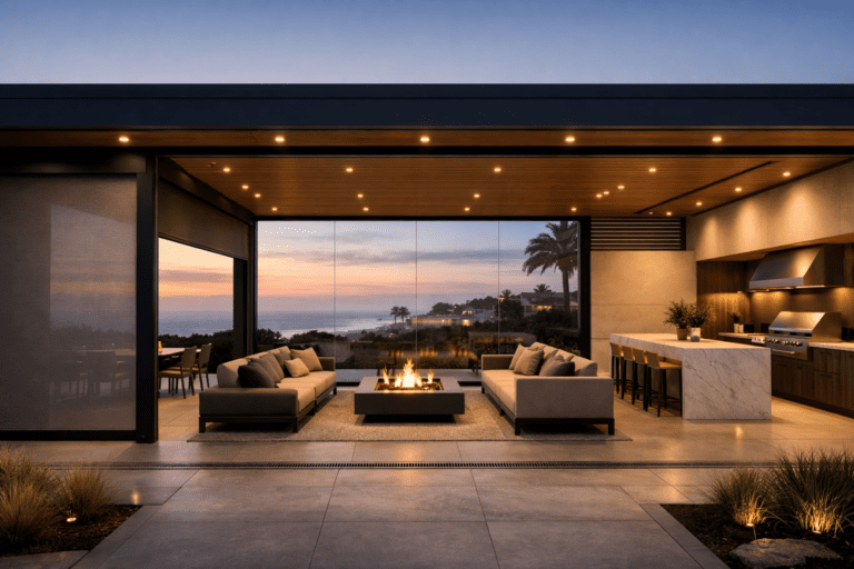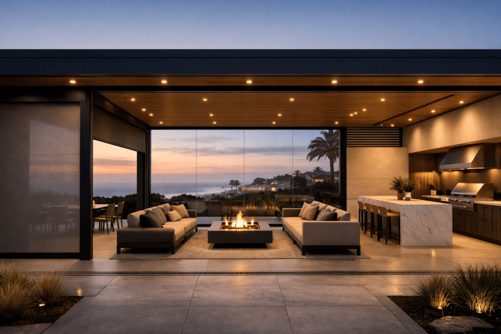 Outdoor room enclosures convert best when planned with screens, heaters, lighting scenes, and the utility backbone so you trench once.