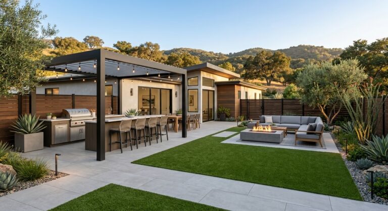 | Good: Entertaining Core | 1,000-1,800 sf porcelain/paver patios & paths; 12′-16′ pergola (ignition-resistant); masonry outdoor kitchen (base appliances); low-glare lighting starter; drainage basics; planting/irrigation refresh. | $100k–$210k+ |